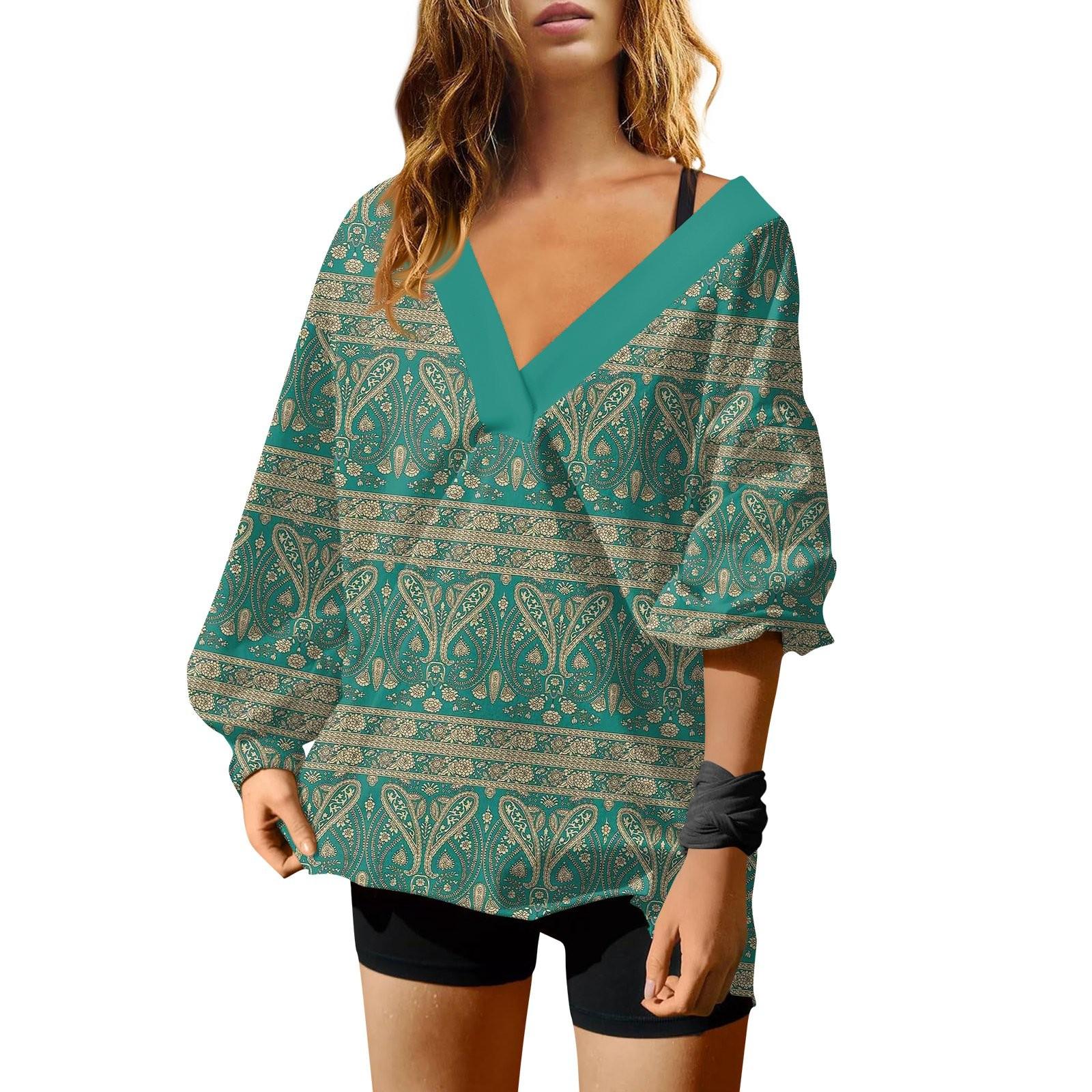 Женская мода V-образный вырез длинный рукав принтованный свободный пуловер свитшот топ XL