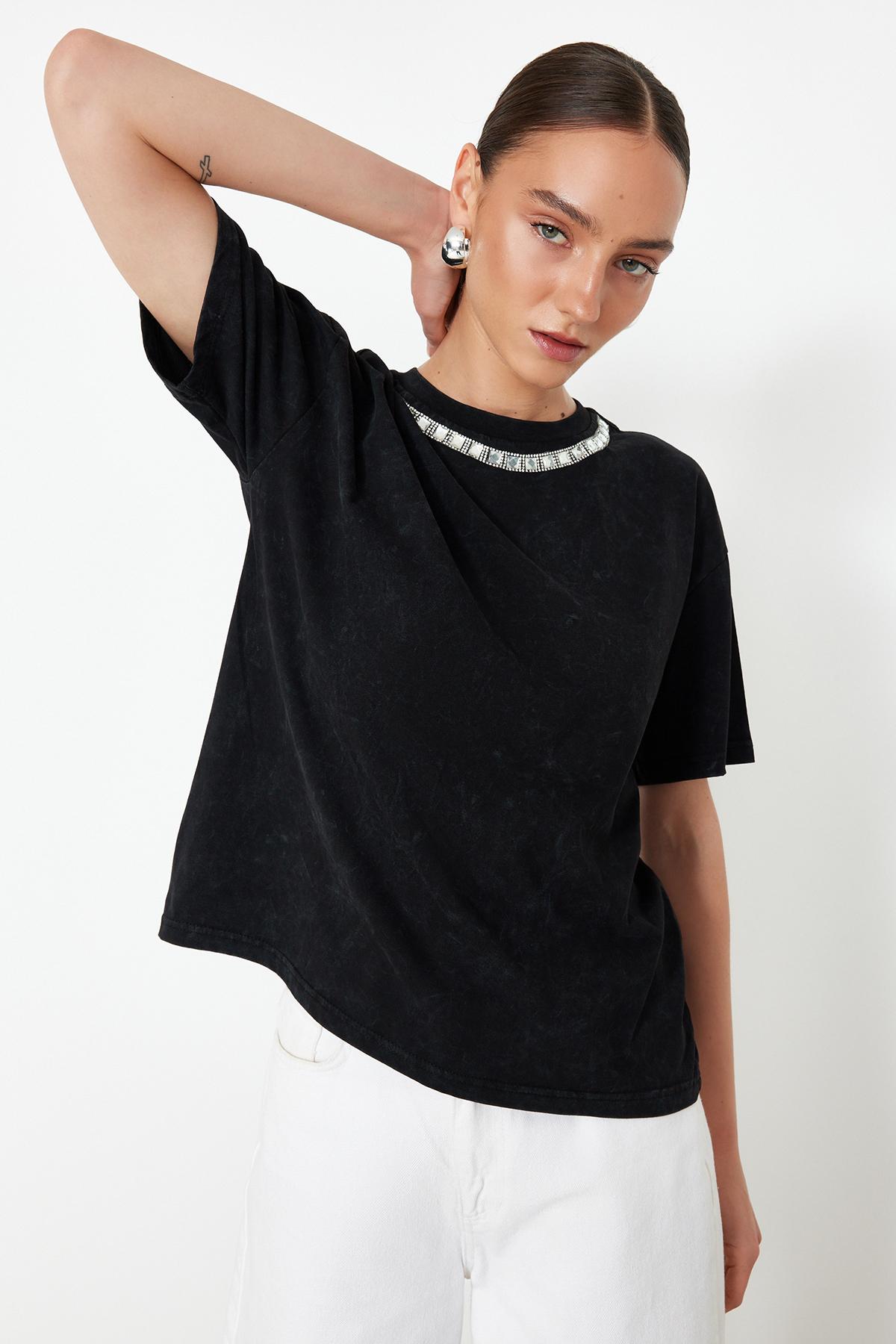 Женская модная новая футболка, черная, из 100% хлопка, с вышивкой под старину, с эффектом выцветания, расслабленная удобная трикотажная футболка с узором