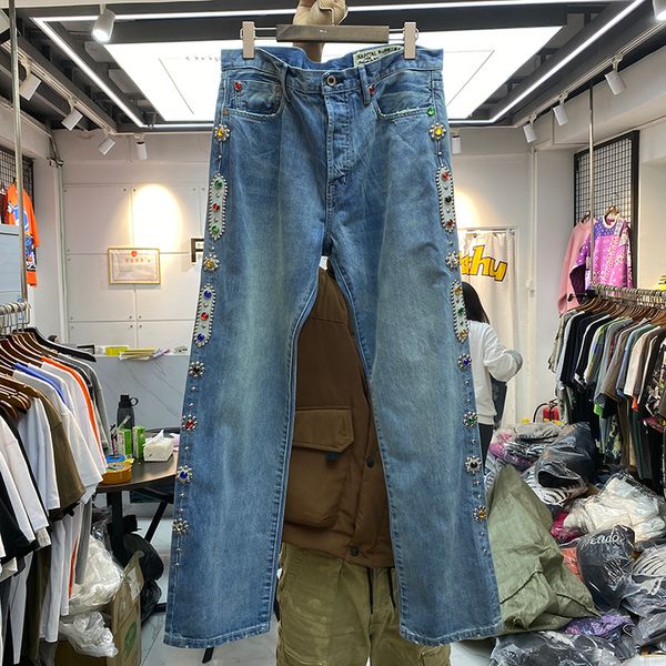 2021 new jeans men women kapital pants vintage washed inlaid gemstone distressed trousers inside tag clothes webv, Blue