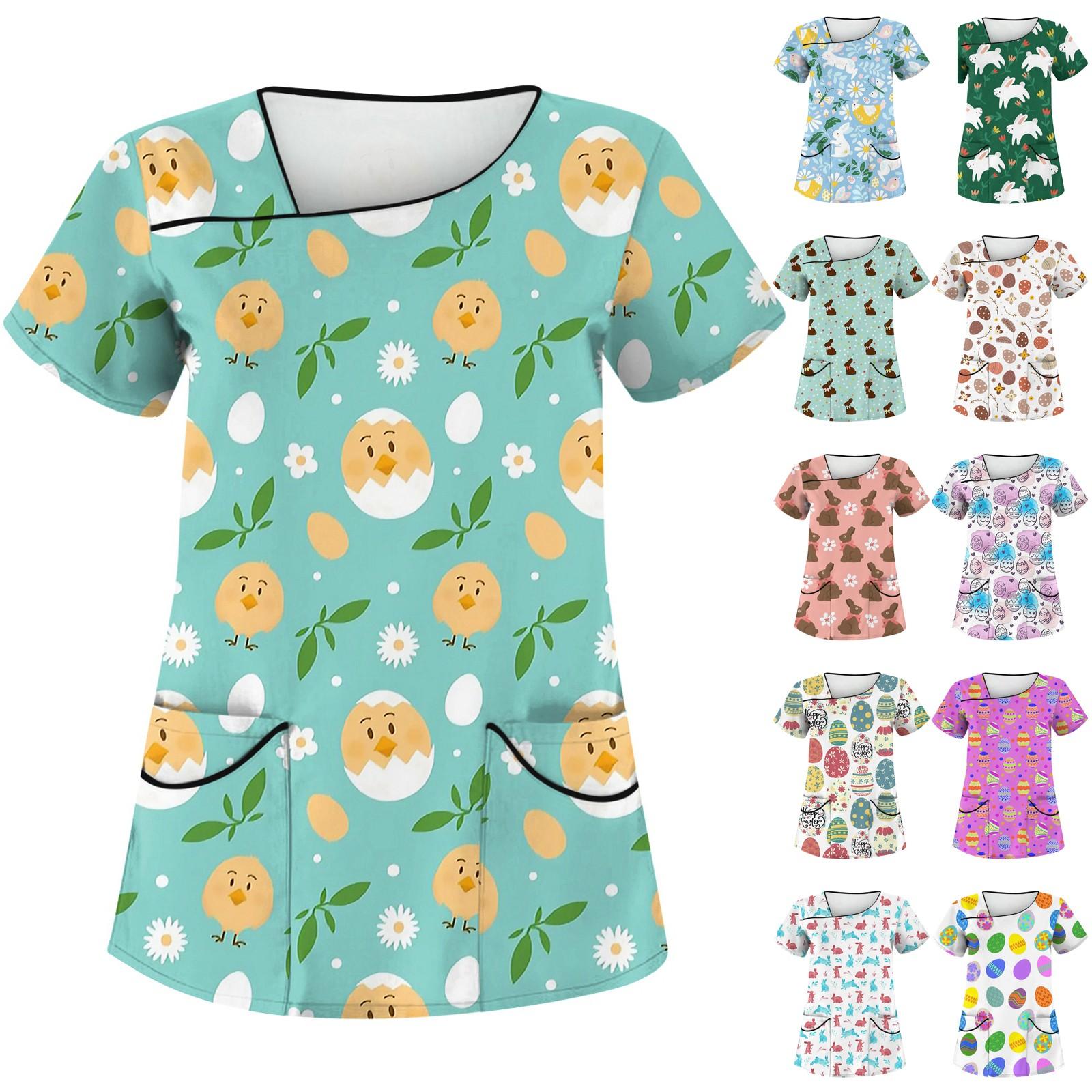 Женская модная полосатая градиентная рабочая одежда с пасхальным принтом и короткими рукавами с двойными карманами