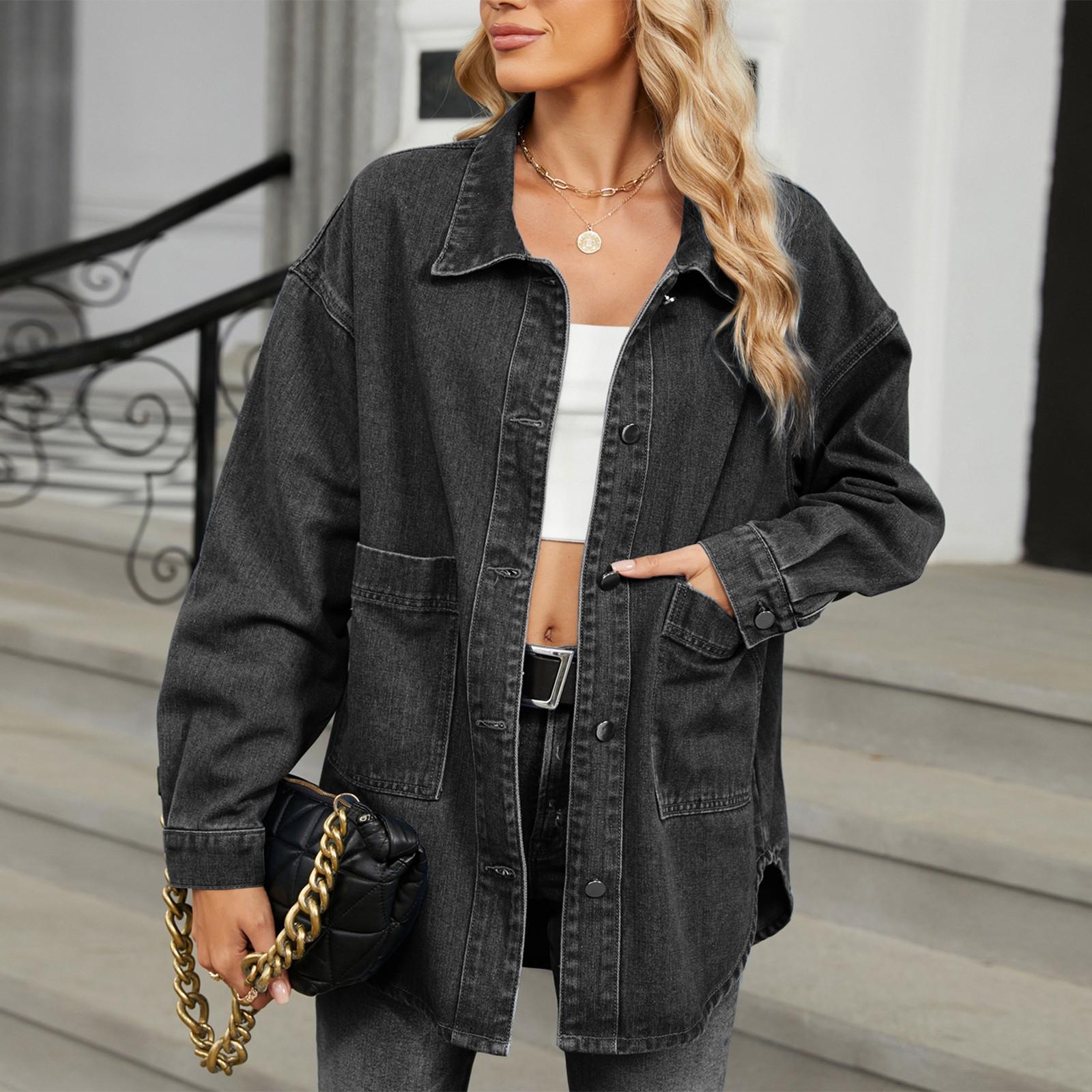 Женская модная универсальная классическая ретро однотонная джинсовая куртка с лацканами, длинными рукавами и карманом, свободного кроя XL чёрный
