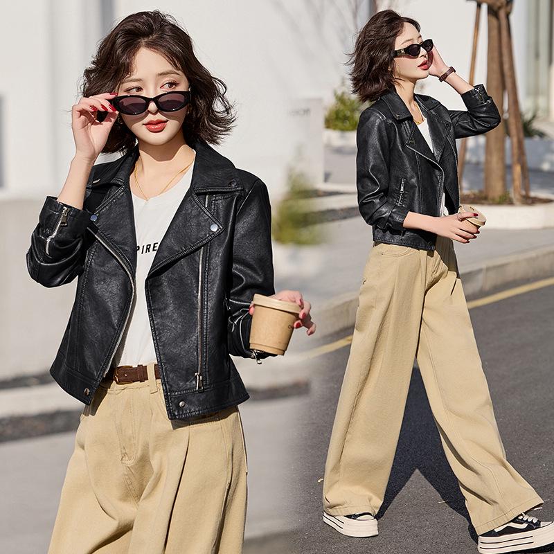 Женская мотоциклетная куртка приталенного силуэта из ПУ кожи - Весенне-осеннее короткое пальто с лацканами (Стиль ZH1180) M 90-108 lbs чёрный