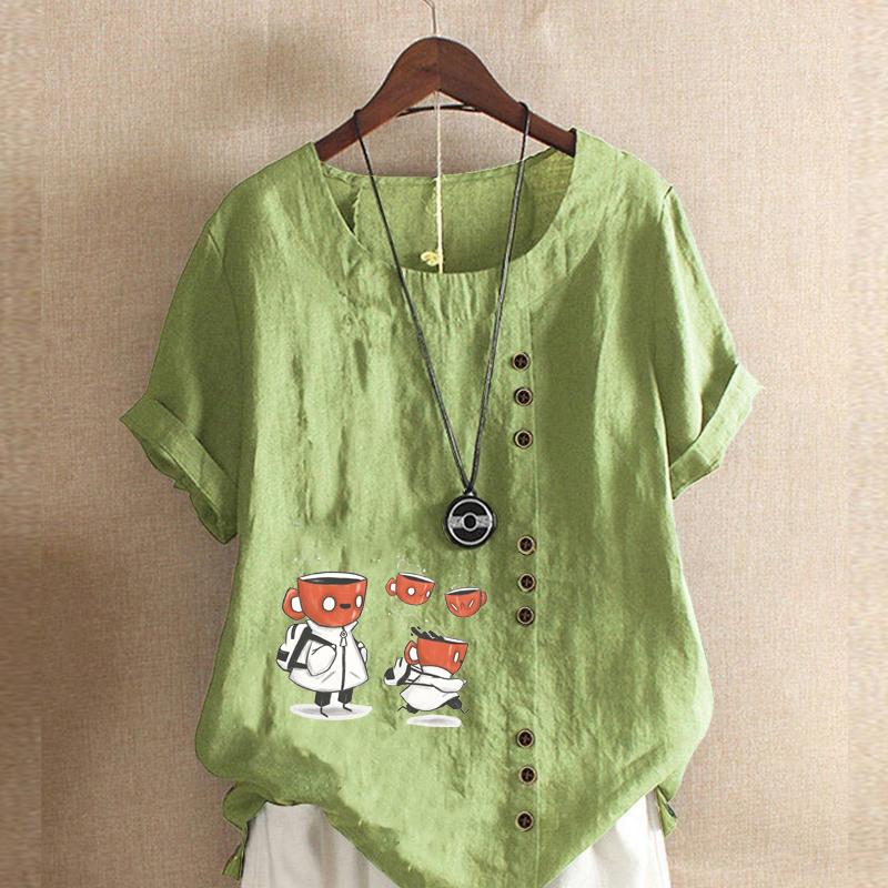 Женская новая модная льняная рубашка с круглым вырезом и коротким рукавом, футболка с принтом «чашечник», летняя женская повседневная блузка больших размеров, топы 5XL зелёный
