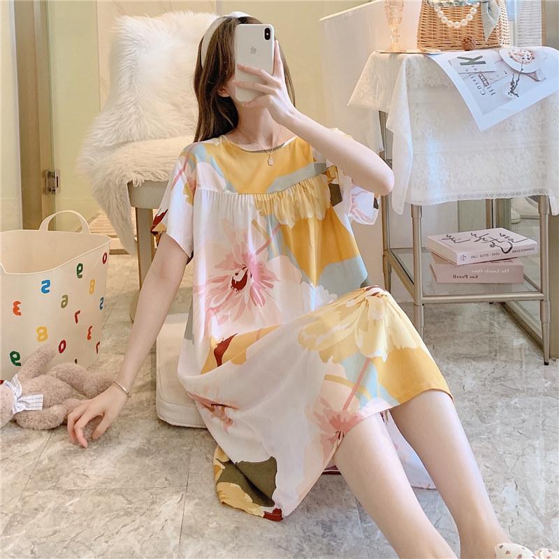 Женская ночная рубашка из хлопка и шелка с мультяшным принтом — короткие рукава, легкая, летняя, пижама больших размеров для дома, весны и осени. One size (suitable for 85-155 lbs)