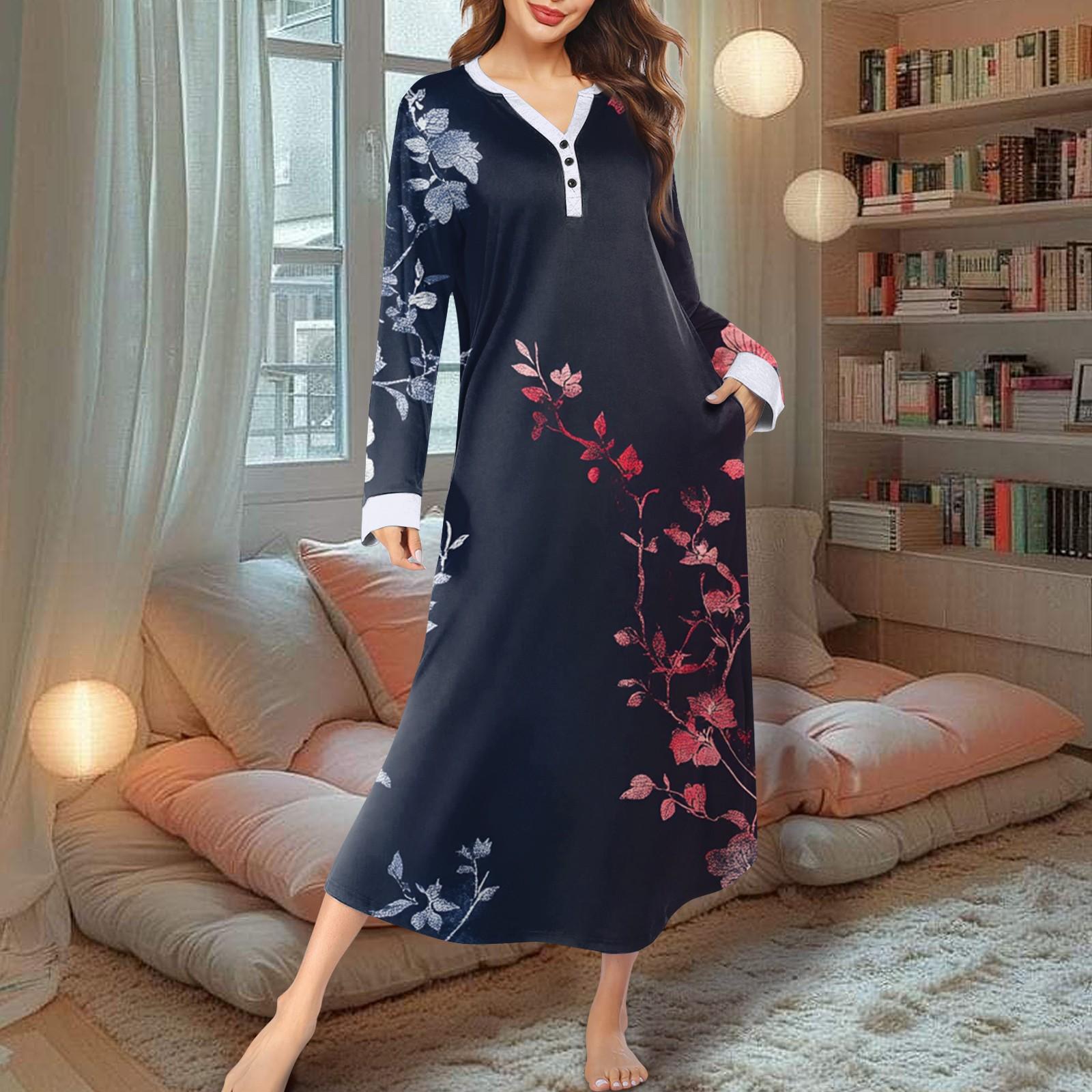 Женская ночная рубашка, модный принт, длинный домашний халат, пижама с V-образным вырезом и карманами, платье XXL красный