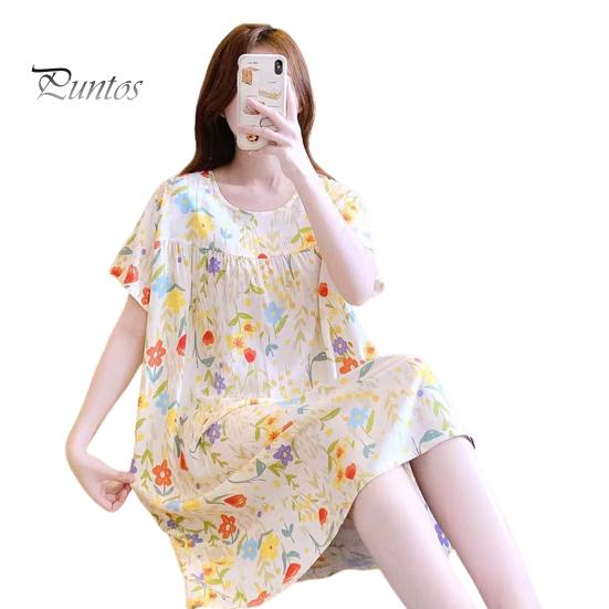 Женская ночная рубашка свободного покроя с цветочным принтом, круглым вырезом, плиссированная, с короткими рукавами, длиной до колена, домашняя одежда, повседневное платье миди, женская ночная рубашка, платье миди белый