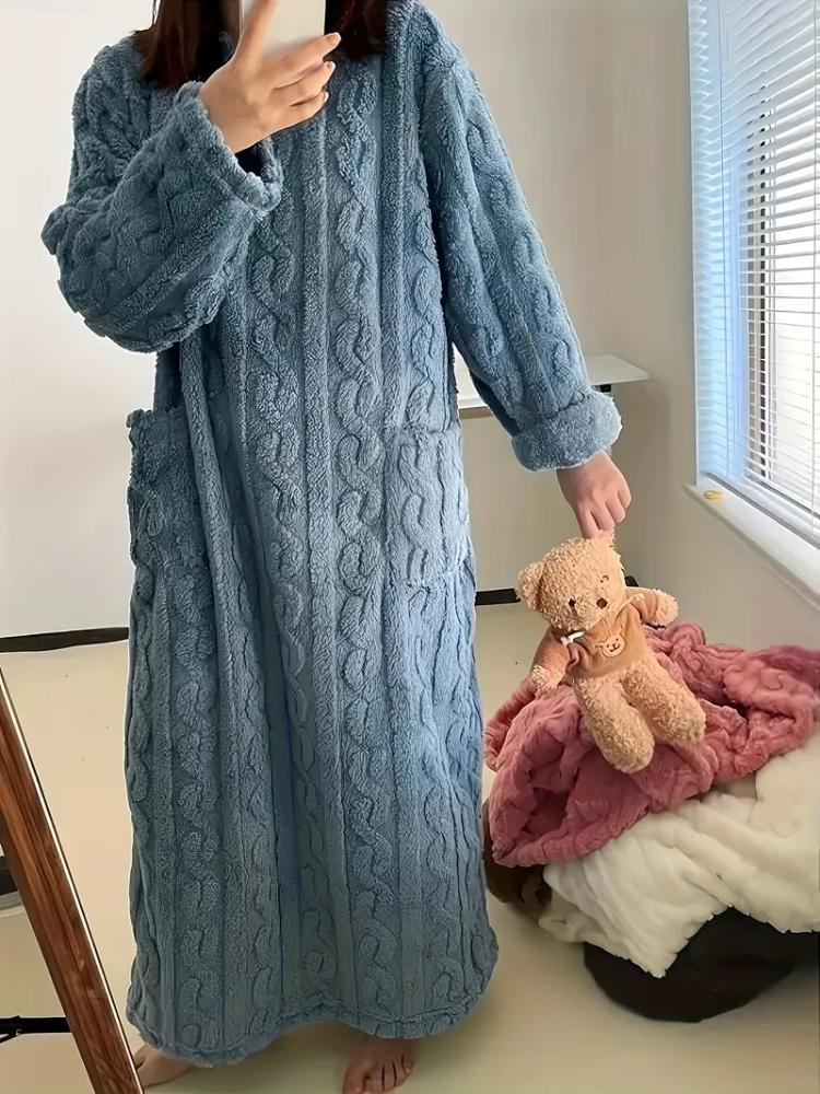 Женская ночная рубашка с длинным рукавом из кораллового флиса - Утепленная, плотная, зимняя, теплая пижама-халат с карманами, плюшевая, мягкая, удобная, прочная ночная сорочка L темно-синий