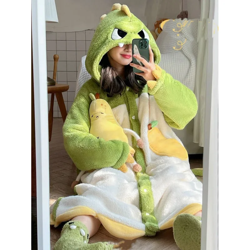 Женская ночная рубашка с капюшоном, осенне-зимняя теплая утепленная Пижама, милые фланелевые ночные рубашки с динозавром для косплея, милые забавные банные халаты