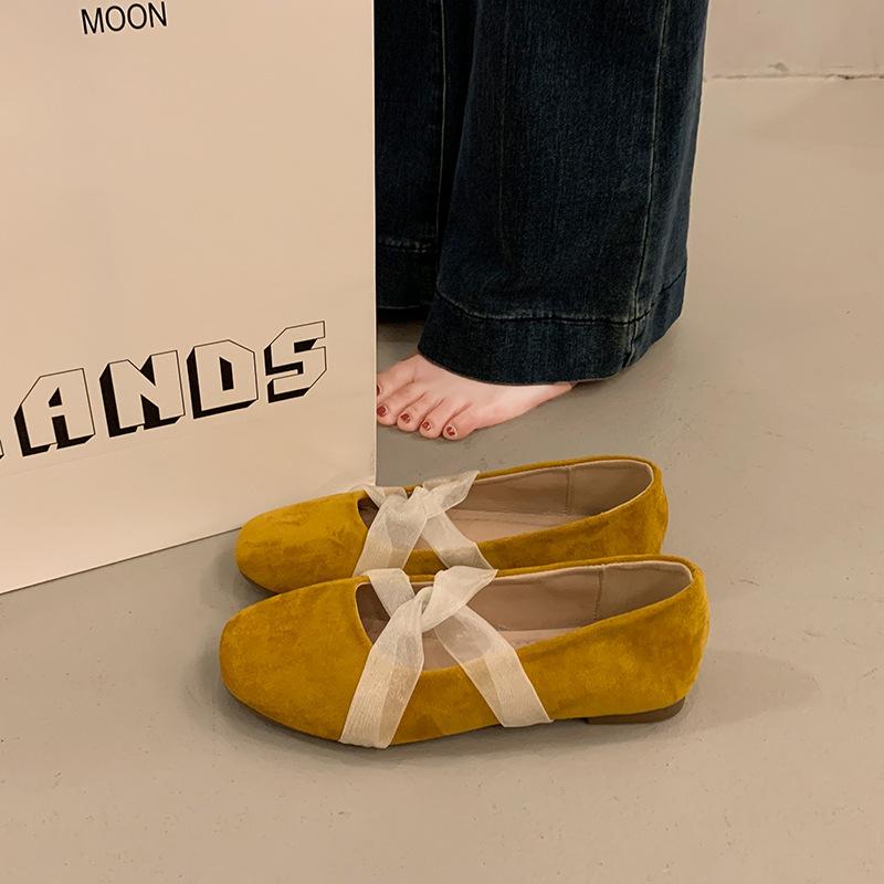 Женская обувь на плоской подошве, нежный ветер, вечерняя обувь, шнуровка, перекрестный ремешок, неглубокий вырез, квадратный носок, замша, универсальная, для通勤, балетки, одинарные 40 жёлтый