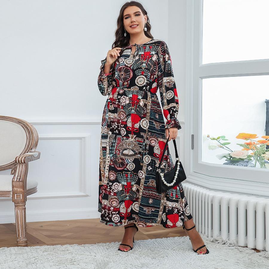 Женская одежда большого размера, модное черное платье с цветочным принтом, свободное облегающее платье больших размеров с длинными рукавами для женщин