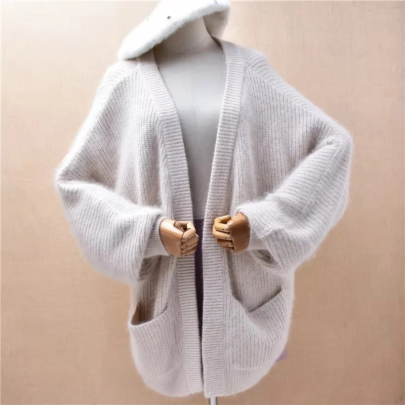 Женская осенне-зимняя толстая теплая волосатая ангорская кроличья шерсть вязаная куртка с длинными рукавами-фонариками свободные кардиганы мантия свитер куртка