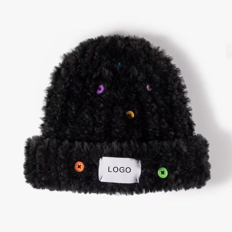 Женская осенне-зимняя толстая теплая меховая вязаная шапка с цветными пуговицами и шерстяная шапка чёрный