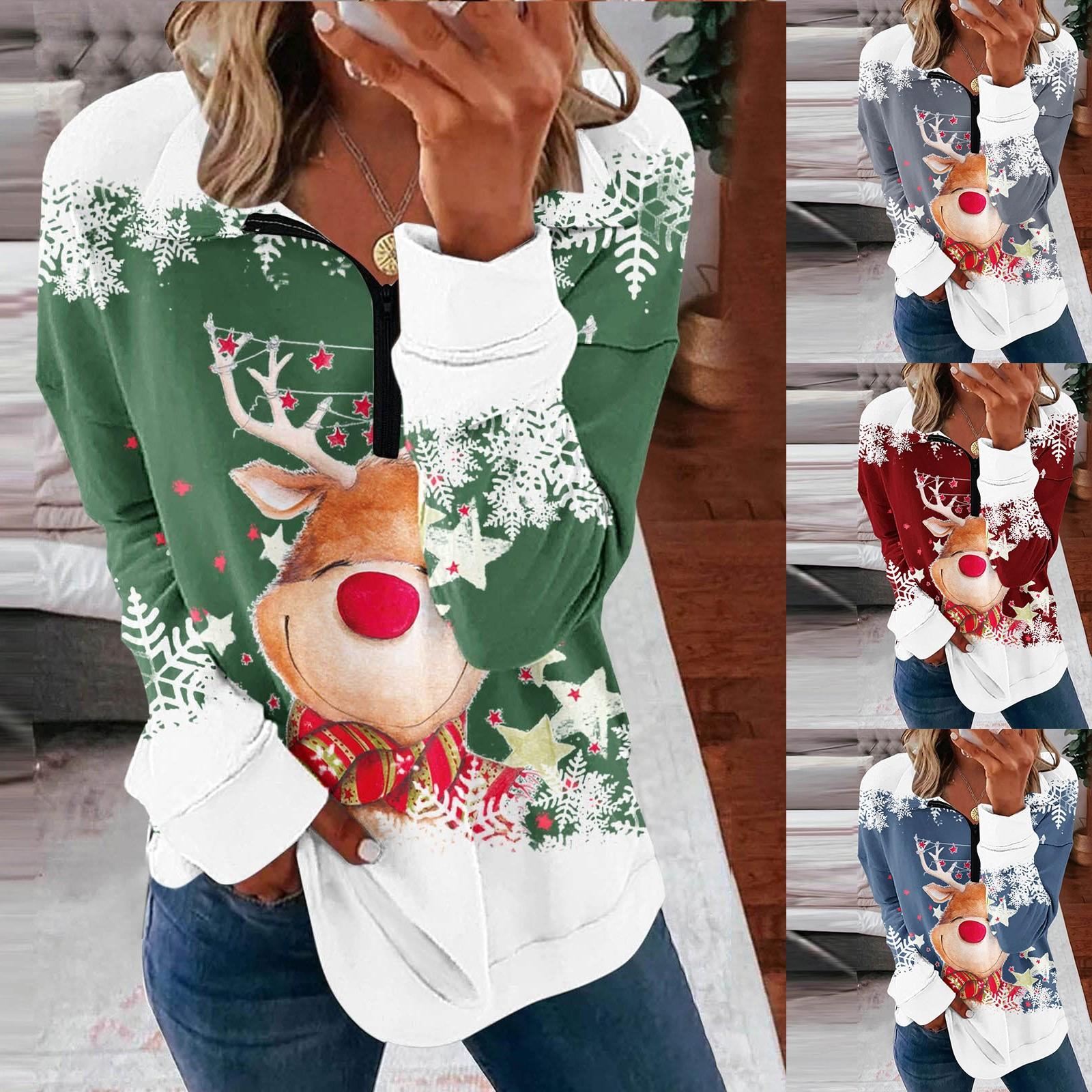 Женская осенне-рождественская мода с принтом, большой пуловер с половиной молнии, толстовка с длинными рукавами, модная одежда, толстовка