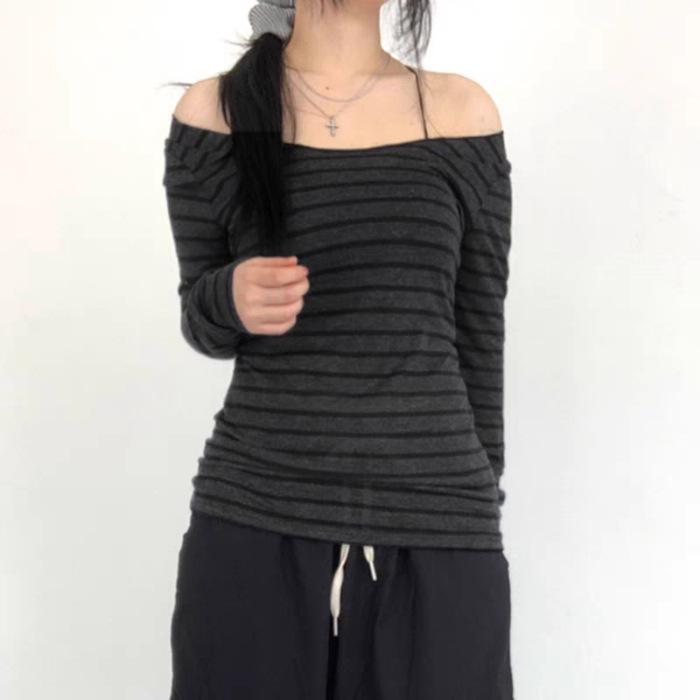 Женская осенняя 2024 года черно-белая полосатая приталенная футболка с длинным рукавом на одно плечо. S темно-серого