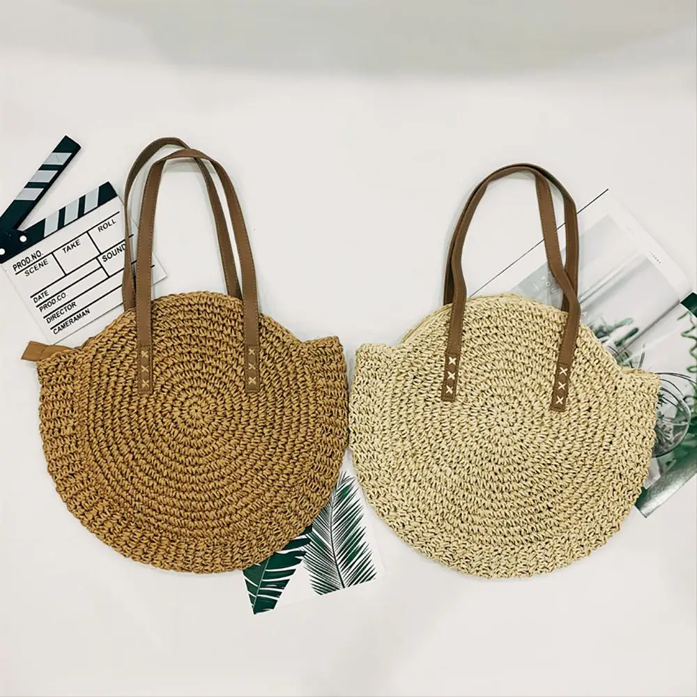 Женская пляжная сумка-тоут ручной работы, уличная плетеная круглая Соломенная Сумочка через плечо с карманом для телефона