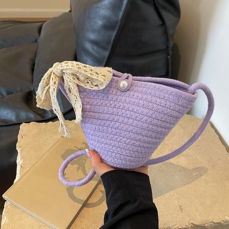 Женская повседневная хлопковая тканая сумка, летняя пляжная сумка, маленькая сумка-шоппер с кружевной лентой и ремнем через плечо