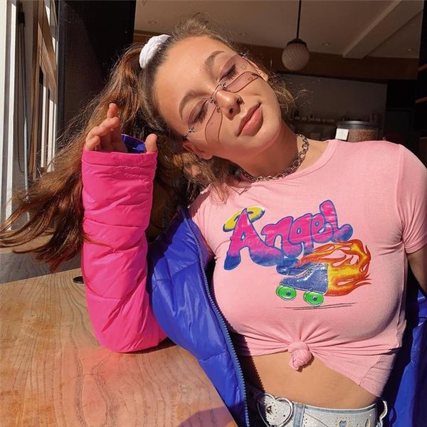 angel printed pink short sleeve t shirts women 2020 new fashion streetwear cool crop lady tees summer style, White