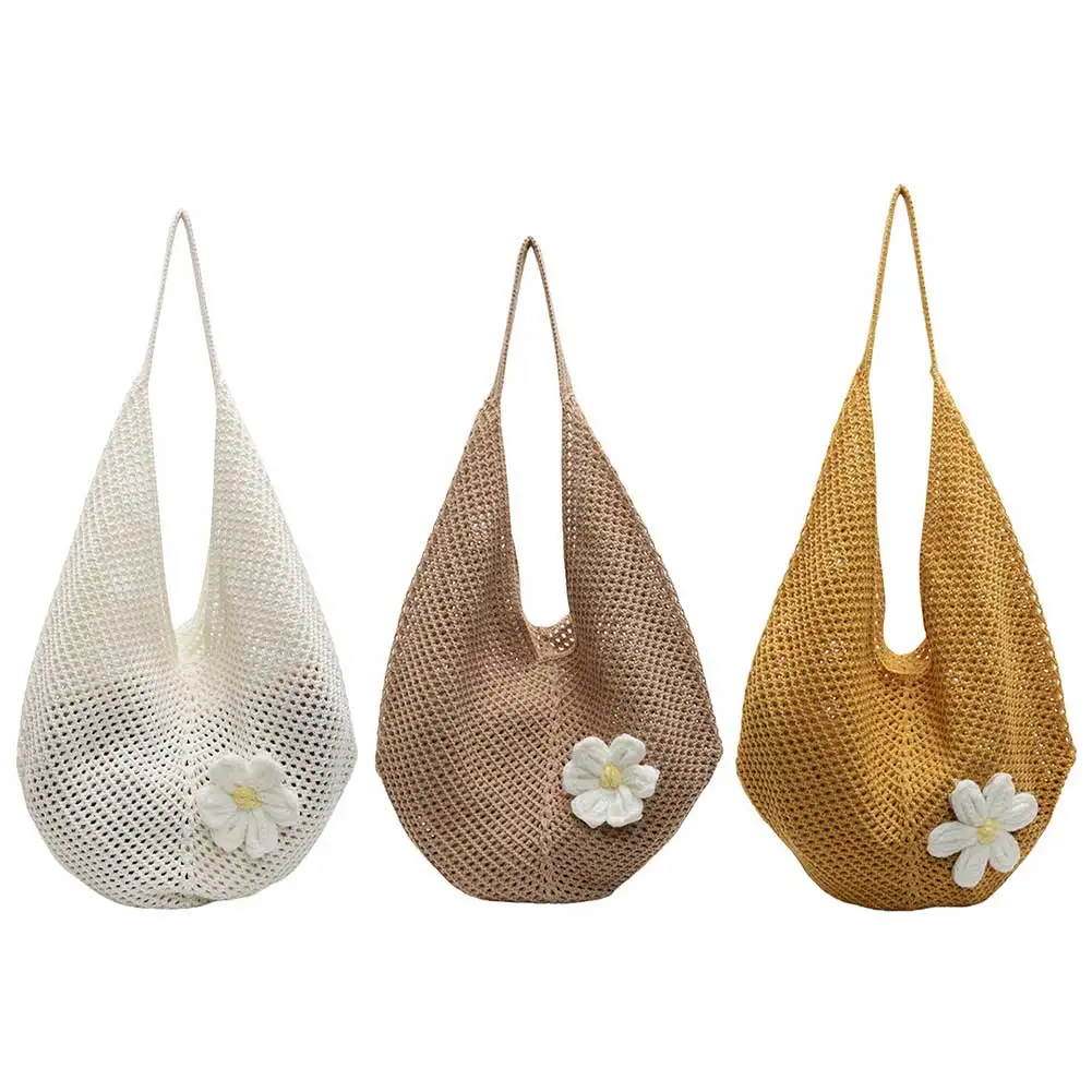 Женская полая тканая сумка на плечо, большая вместительная сетчатая пляжная сумка, вязаная крючком сумка на плечо с цветком, дорожная сумка для покупок