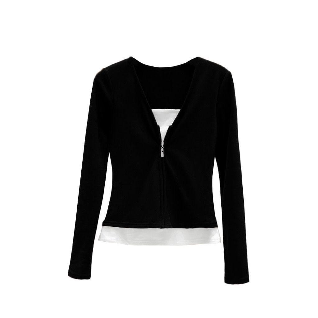 Женская приталенная черная футболка с длинным рукавом и застежкой-молнией, в стиле пэчворк, для осени/весны L (for 48-53 kg) чёрный