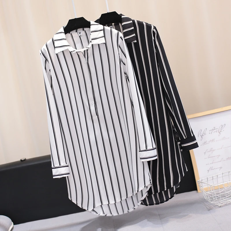 Женская рубашка в полоску, Новинка осени 2019, большие размеры, с длинным рукавом, воротник поло, средний стиль, черно-белые полосатые топы, Пов...