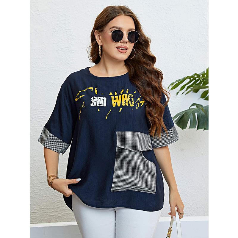 Женская рубашка с круглым вырезом и короткими рукавами, повседневная свободная пуловерная футболка с графическим принтом, клетчатая лоскутная дышащая легкая летняя рубашка для поездок на работу плюс 3XL синий