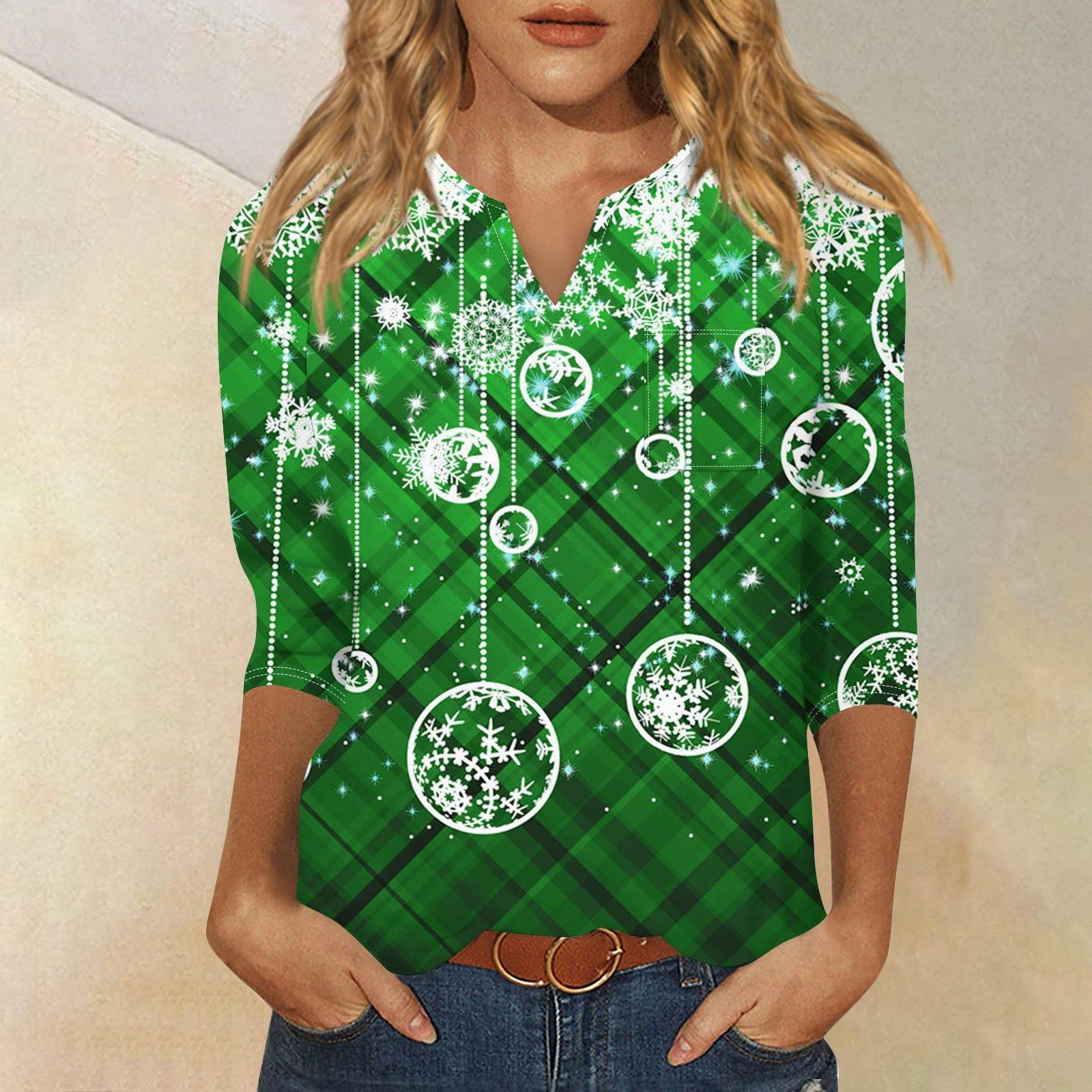 Женская рубашка с рукавом семь дюймов, напечатанная в стиле ретро, повседневная, свободная, с V-образным вырезом, рождественская S зелёный