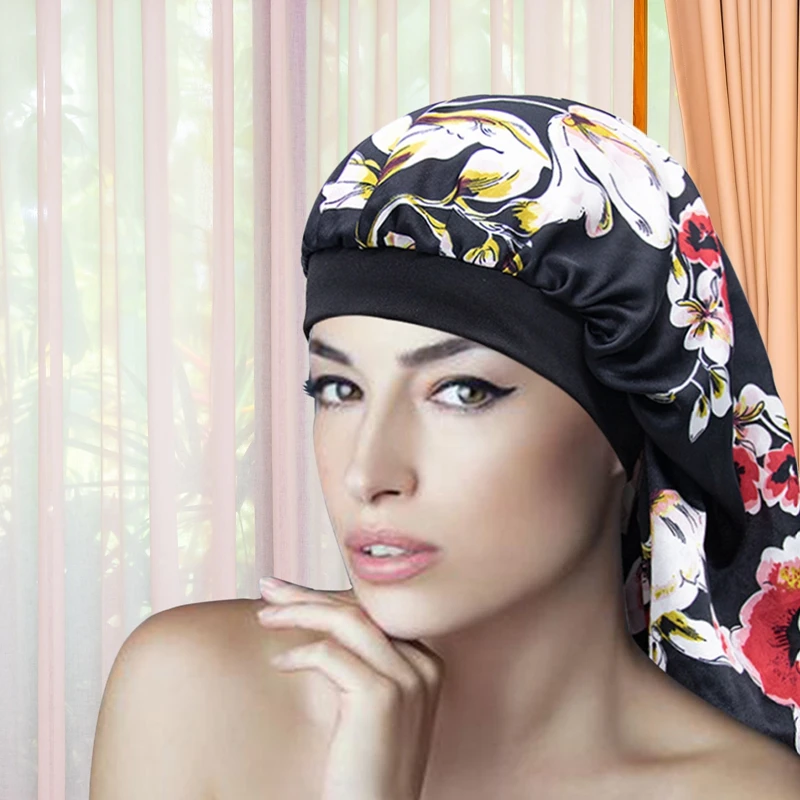 Женская сверхдлинная Атласная шапочка, 1 шт., банная шапочка, цветная Цветочная эластичная повязка, шелковая ночная шапка для вьющихся косич...