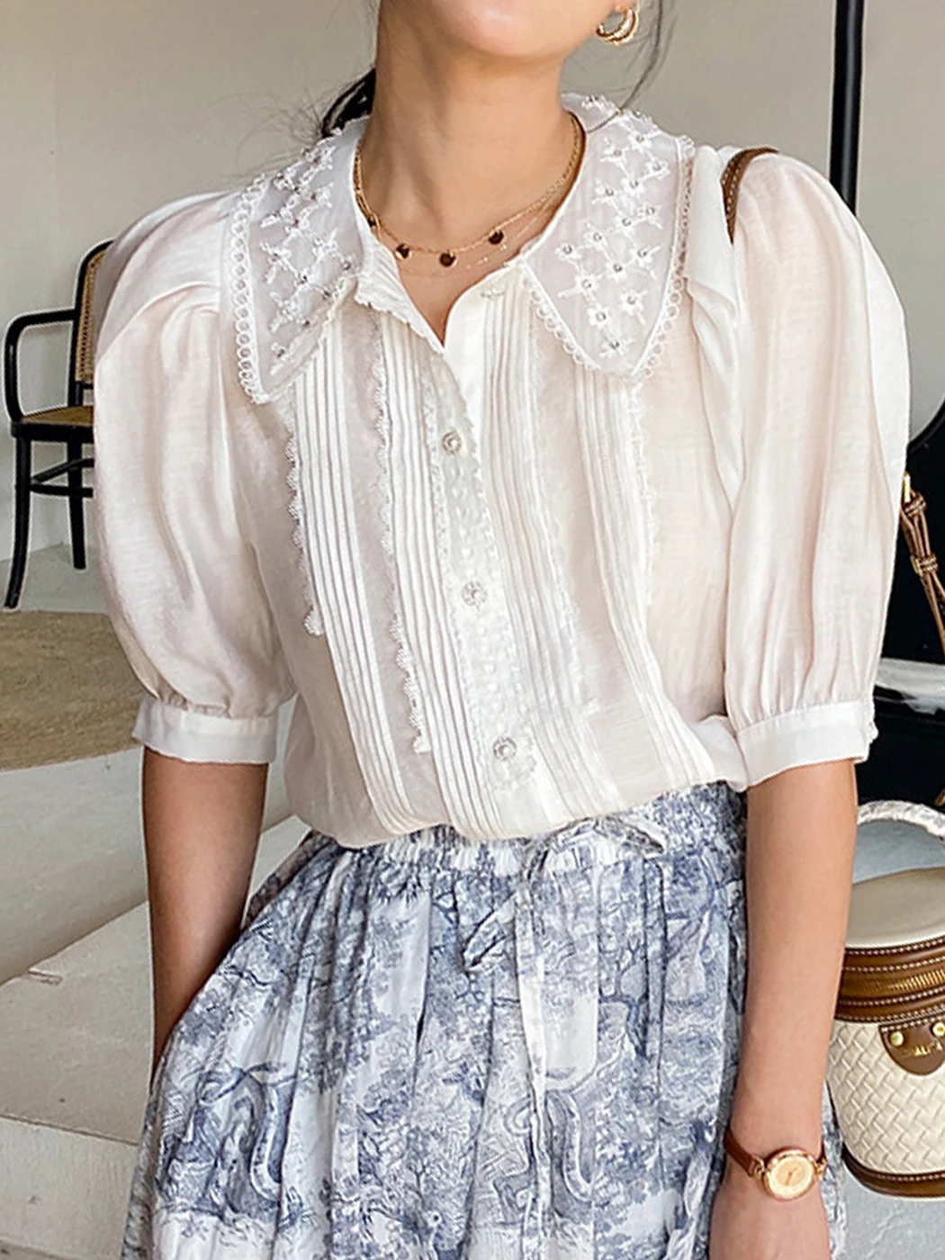 Элегантная женская летняя рубашка во французском стиле, плиссированный праздничный кардиган с украшением из бисера и кукольным воротником...