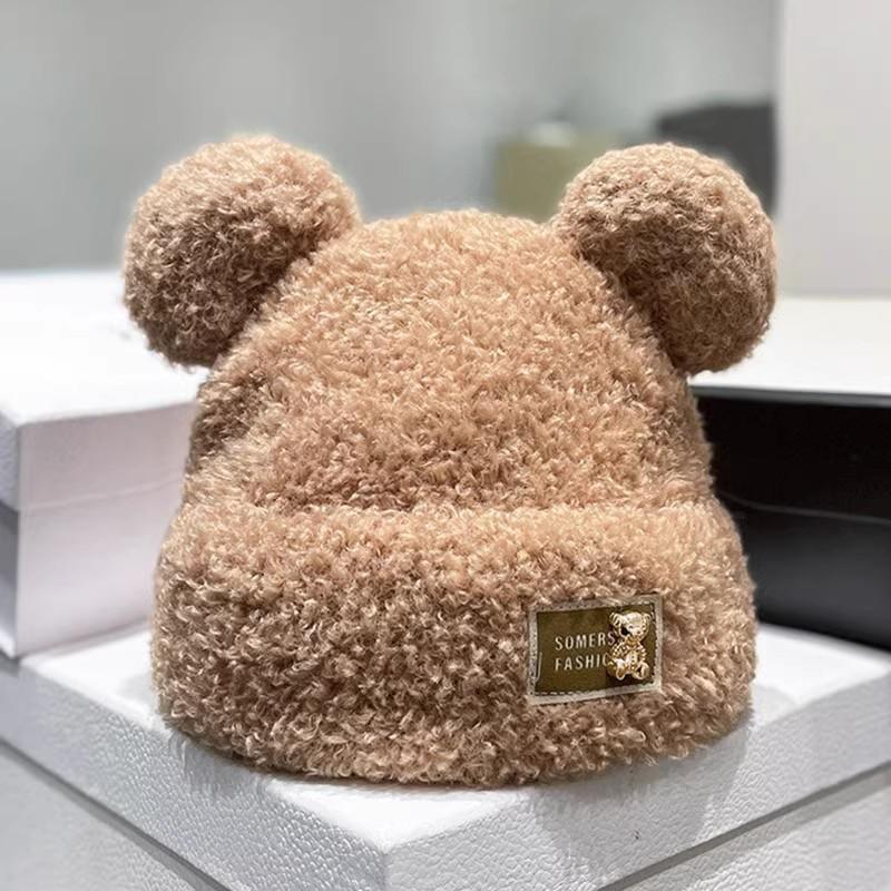 Женская симпатичная зимняя плюшевая шапка-бини с мультяшными ушками медведя, вязаная шерстяная шапка для девочек, однотонная, утолщенная, из овечьего флиса, зимние шапки хаки