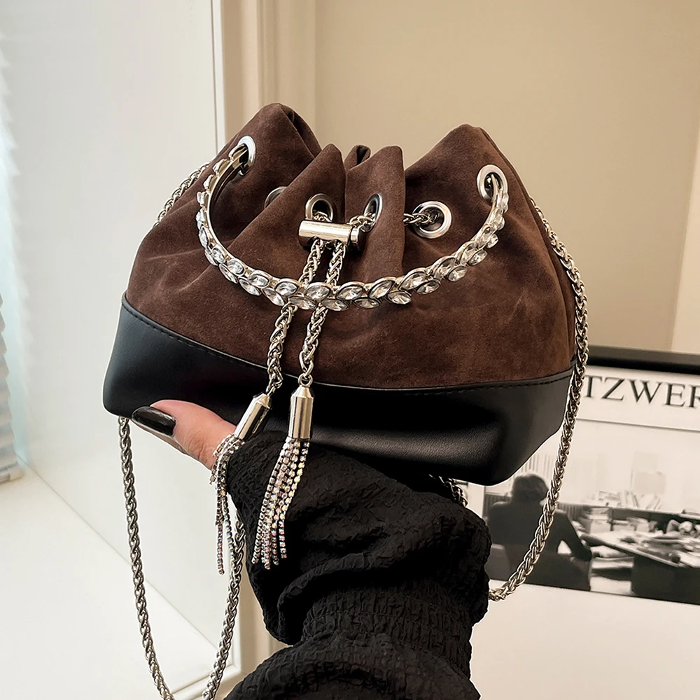 Женская сумка-ведро в стиле ретро, матовая лоскутная сумка-ведро, осенне-зимняя ручная сумка через плечо с цепочкой и шнурком, универсальная сумка через плечо для поездок на работу