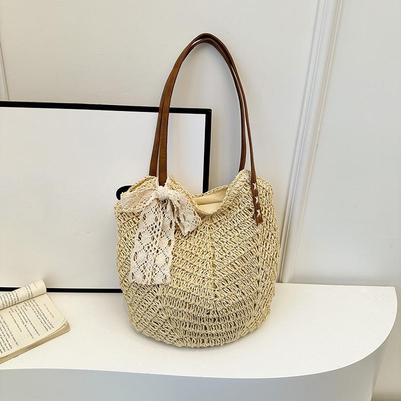 Женская сумка-тоут из соломы и кожи, женская летняя сумка из ротанга, женская плетеная пляжная сумка через плечо ручной работы в стиле бохо 26x1x35cm бежевый