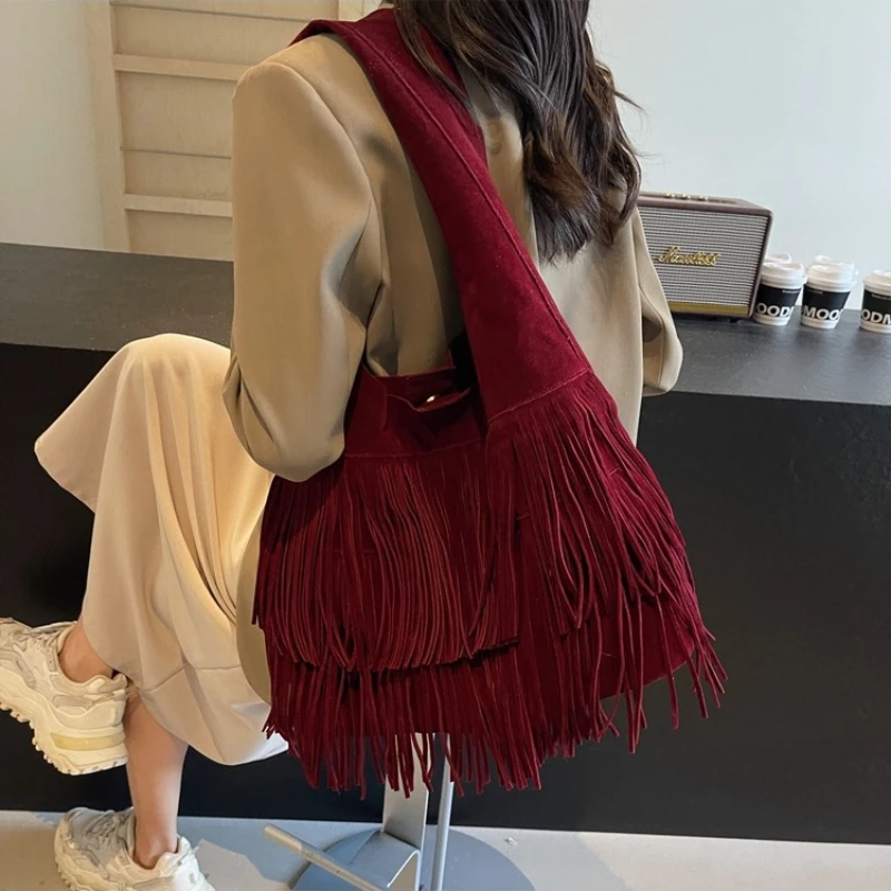 Женская сумка через плечо большой вместимости в стиле ретро, новинка 2023 года, модная дорожная сумка-хобо, осенняя большая замшевая сумка с кисточками в стиле бохо