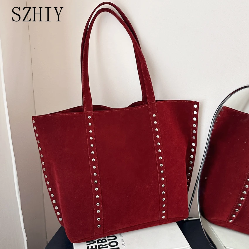 Женская сумка через плечо в стиле ретро, роскошная дизайнерская замшевая сумка-тоут большой емкости с заклепками Mochila, винтажный офисный портфель высокого качества