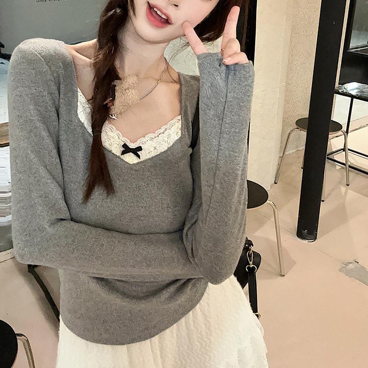 Женская теплая немецкая бархатная футболка с длинным рукавом и кружевом - коллекция осень/зима Medium серый