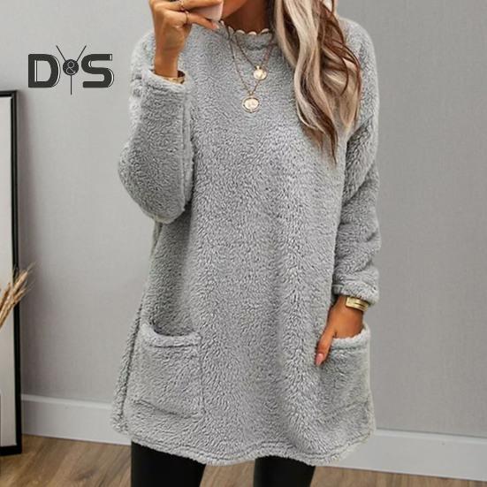 Женская толстовка осень-зима, мягкая, плотная, плюшевая, однотонная, с длинным рукавом, ветрозащитная, полувысокий воротник, теплая, повседневная, средней длины, с карманами, свободный женский пуловер L серый