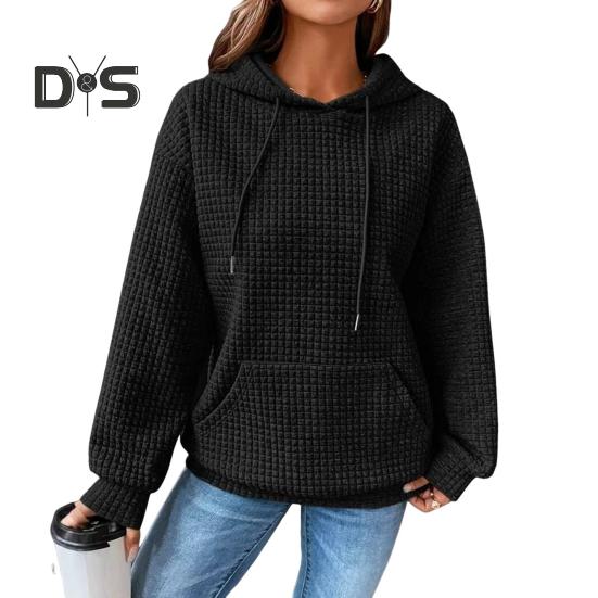 Женская толстовка с капюшоном на осень-зиму с толстой вафельной текстурой, длинными рукавами и большим карманом, однотонная, свободная, эластичная, со шнурком, спортивная кофта S чёрный