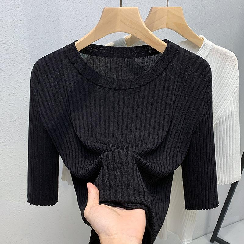 Женская тонкая новая женская одежда спереди на плечах круглый вырез футболка с полурукавом темперамент эластичная талия топ XL чёрный