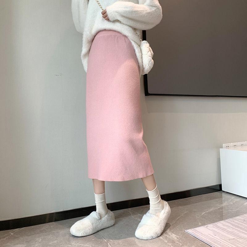 Женская трикотажная юбка средней длины с разрезом на ягодицах, высокая талия, шерстяная юбка средней длины, однотонная универсальная женская юбка One Size розовый