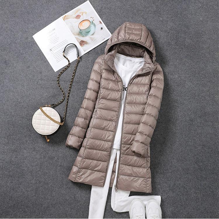Женская ультралегкая упаковываемая длинная куртка-пуховик Осень Зима Теплая Шапка Съемный Капюшон Женское Пальто Парка 5XL 7XL M хаки