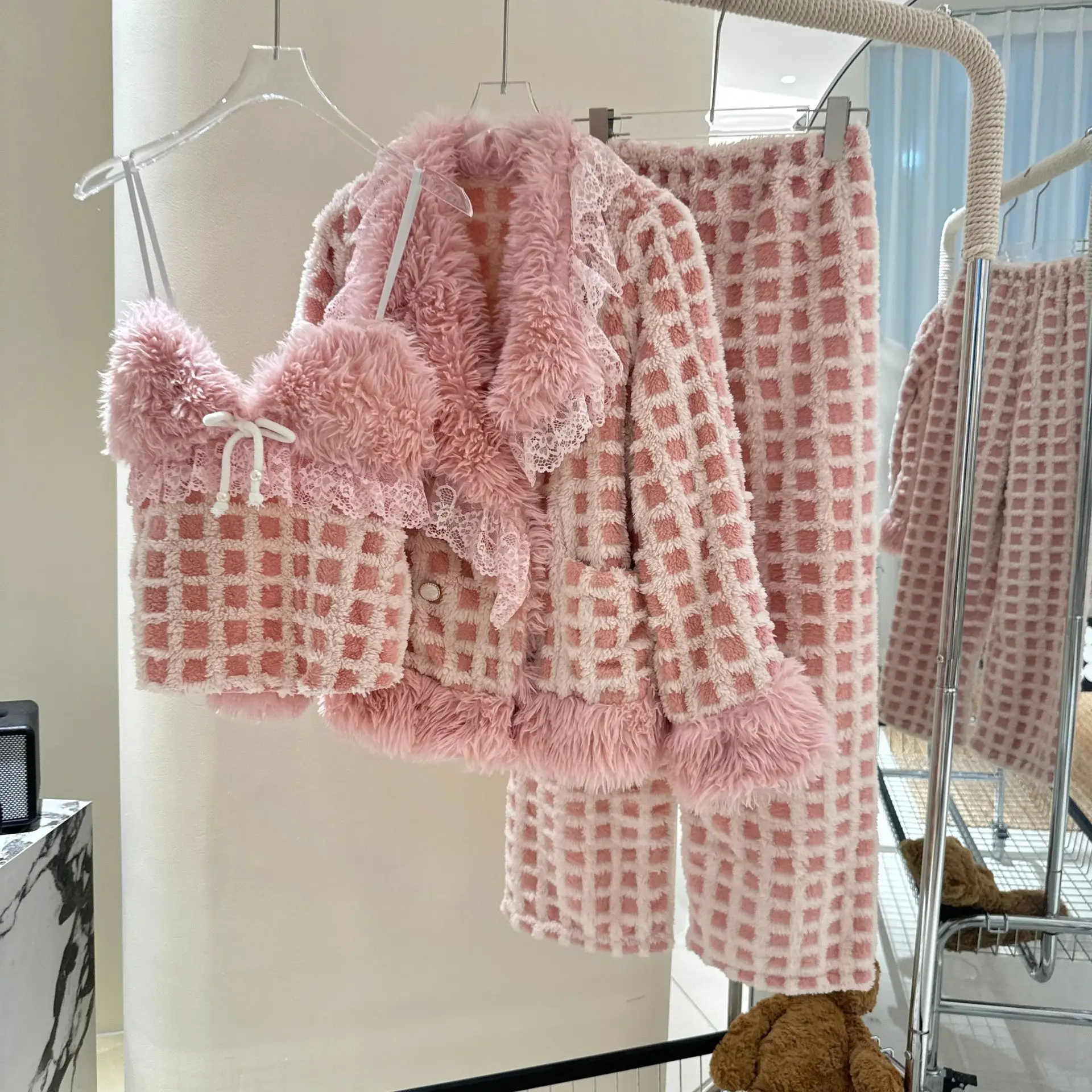 Женская утепленная теплая розовая клетчатая фланелевая ночная рубашка, зимняя рубашка из кораллового флиса, брюки-слинг, 3 шт., пижамный комплект одежды для сна