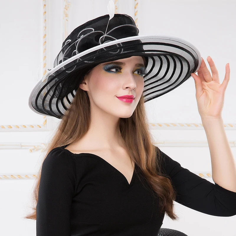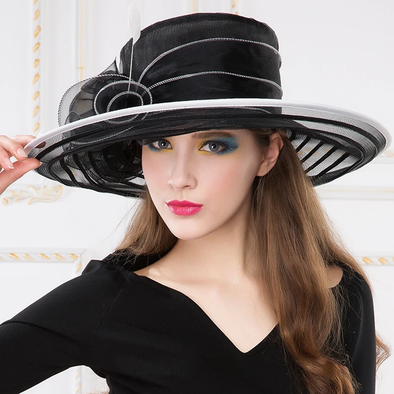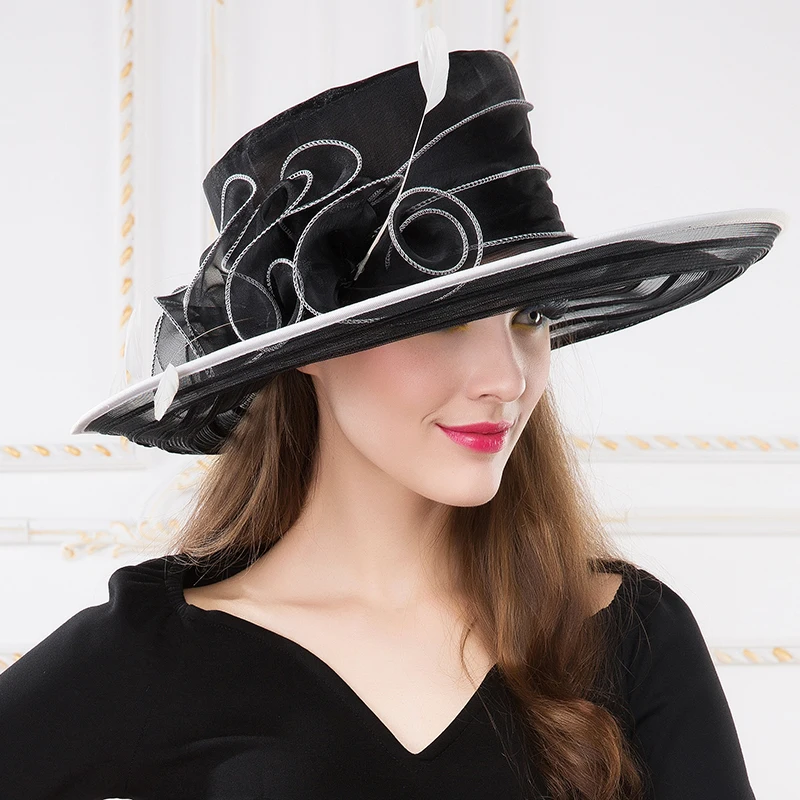 Женская фетровая шляпа с большими полями, черная винтажная Шляпка из органзы в цветочек, для свадебного платья, для лета, в стиле Кентукки, Д...