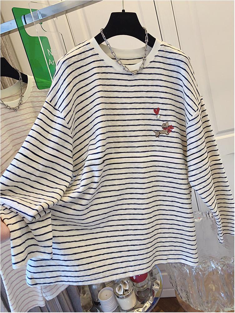 Женская футболка больших размеров в европейском стиле, полосатая, с длинным рукавом, с вышивкой в виде сердца и щенка, для осени/зимы 2025. Large чёрный