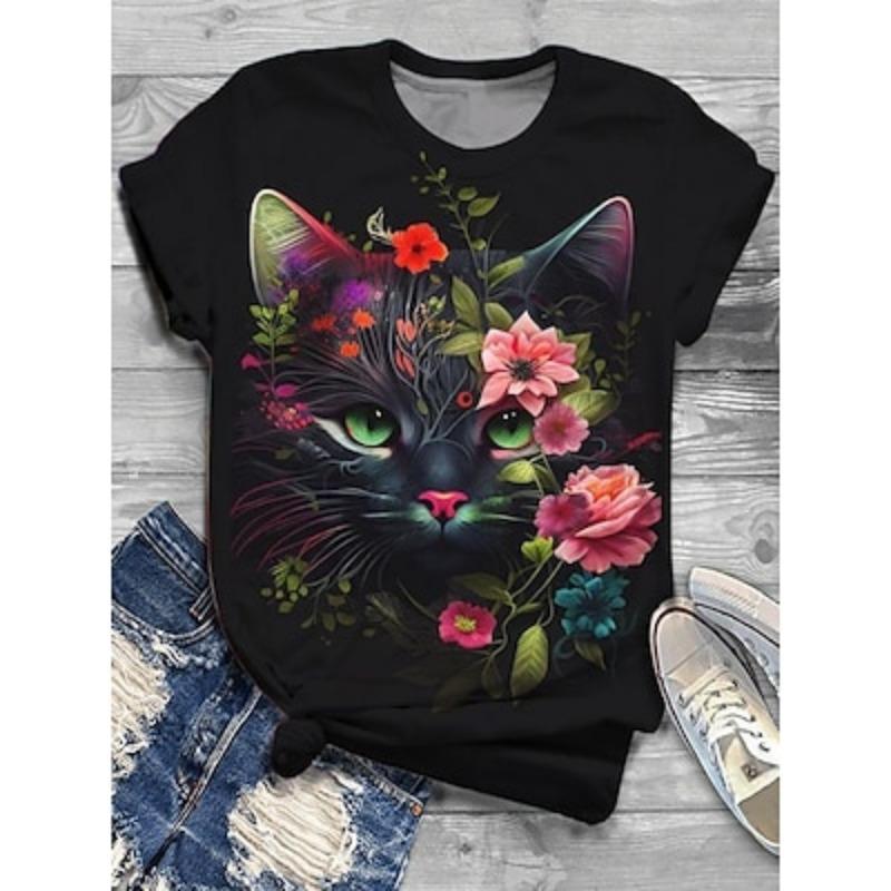Женская футболка, модная, забавная, с цветочным принтом и принтом кошек, с коротким рукавом, обычная, с круглым вырезом, для праздников, выходного дня, черная, желтая, красная, синяя, коричневая, весна и лето S