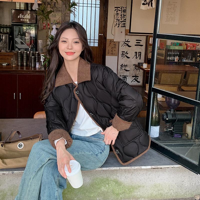 Женская хлопковая куртка с лацканами осень/зима 2025 новая зимняя короткая контрастная американская ретро ромбовидная клетка хлопковая одеждалет хлопковая куртка тонкая M чёрный