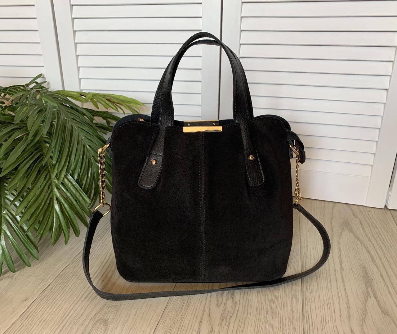 Женская черная замшевая сумка вместительная шоппер сумочка натуральная замша+экокожа, Черный