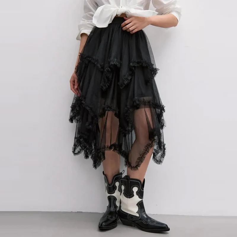 Женская черная сетчатая юбка, модная нерегулярная юбка средней длины, элегантная одежда с оборками в стиле Y2k, эластичная талия