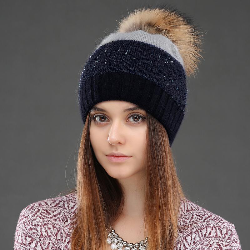 Женская шапка зимняя с пайетками вязаная шапочка из меха кролика модная теплая повседневная шапка с помпоном из натурального меха енота женская тёмно-синий