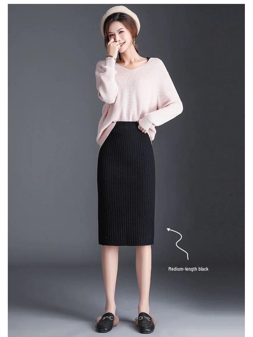 Женская шерстяная трикотажная юбка с высокой талией и разрезом 2021 года — облегающая, длинная, плотная, стиль осень/зима XL, 65 cm чёрный