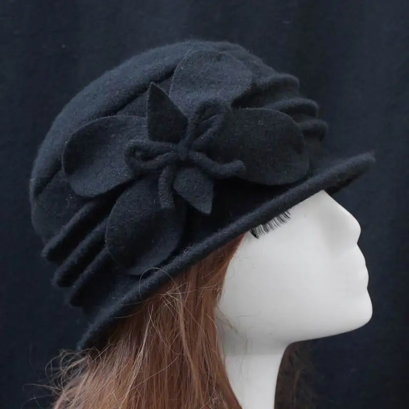Женская шерстяная шляпа в стиле ретро, однотонная теплая фетровая шляпа с цветочным принтом, в винтажном стиле, Осень-зима