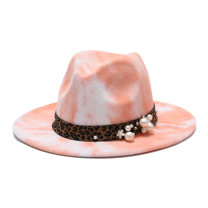 Женская шерстяная шляпа Tie-dye с широкими полями, цветочным поясом и жемчугом, Ранняя Весенняя цветная шляпа, Женская фетровая шляпа с крупным...